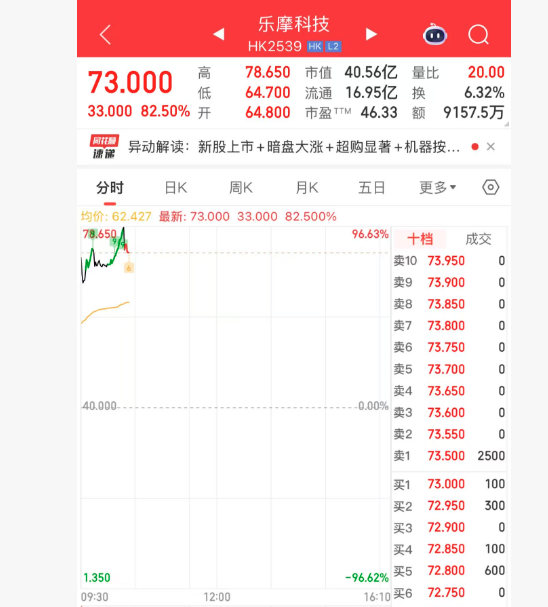 上证报中国证券网讯(记者李五强)12月3日,乐摩科技(02539.HK)正式登陆港股市场。上市首日,该股一度涨96.63%,最高报78.65港元/股。截至10时23分,乐摩科技股价报73.00港元/股,涨幅为82.50%。
