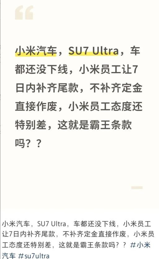 近日,小米汽车被推上舆论的风口浪尖。多位消费者在社交平台集中反映,在小米SU7尚未交付、甚至尚未下线的情况下,就被要求提前支付全部尾款,并被告知“不付款将取消订单且定金不退”。此事迅速引发大量网友围观,不少人质疑小米汽车是否存在“霸王条款”行为,甚至指责其“变相圈钱”。