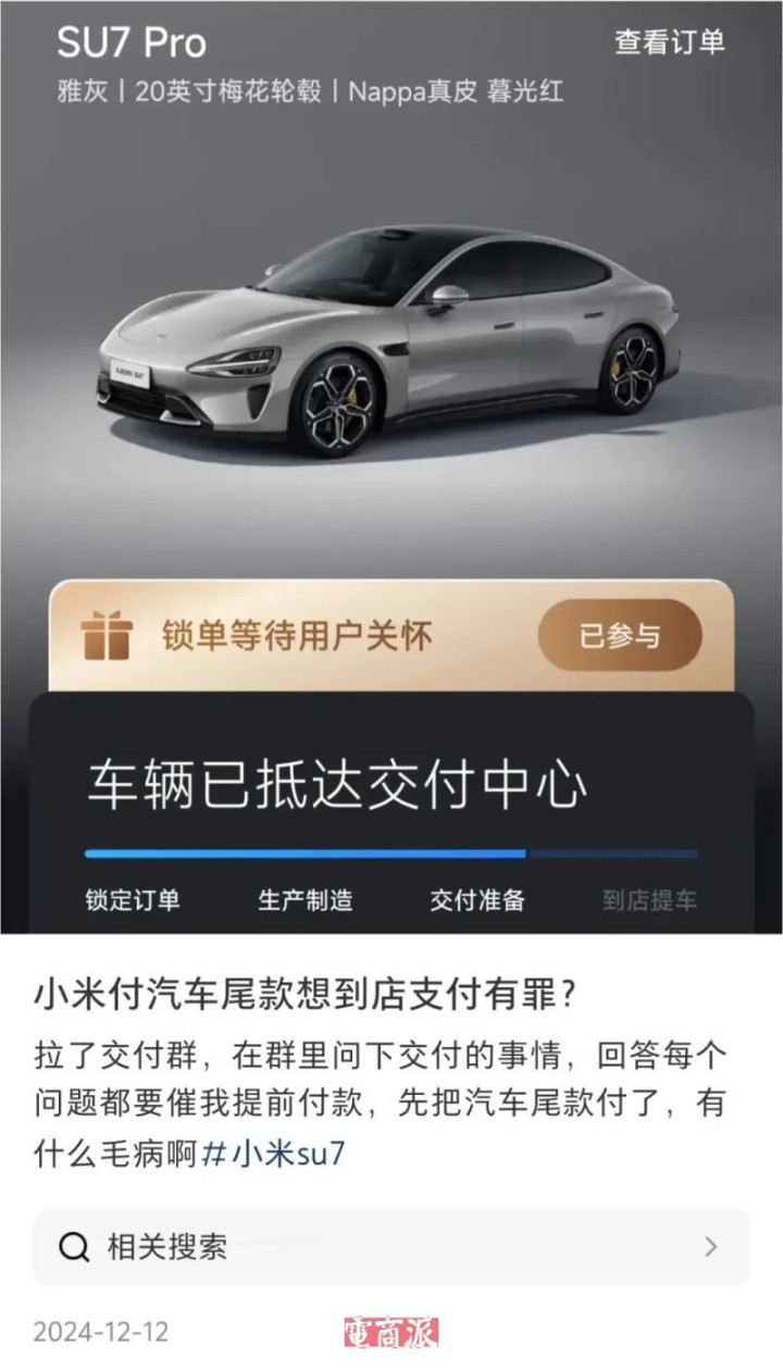 其中,杭州一位用户的案例尤为典型。他于2024年4月订购小米SU7,支付了5000元定金,原计划7月提车。然而2024年12月,小米以“工厂备料需求”为由,要求在7日内支付全额尾款。用户照做后,却被告知仍需重新排队,交付推迟至2025年4月,足足比原计划晚了9个月。期间尾款也被一度退回,订单状态反复修改,用户最终对小米汽车的交付流程彻底失去信任。