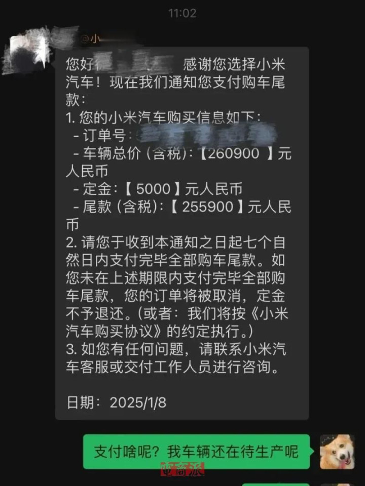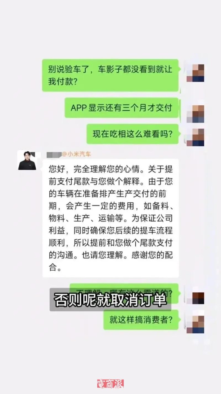据多位用户在小红书、百度有驾、某车平台爆料,用户在小米汽车App下定后,在车辆尚未到店、未完成验车环节时,就收到“7天内必须支付尾款”的通知。如拒绝支付,订单将被取消,且此前支付的定金不予退还。