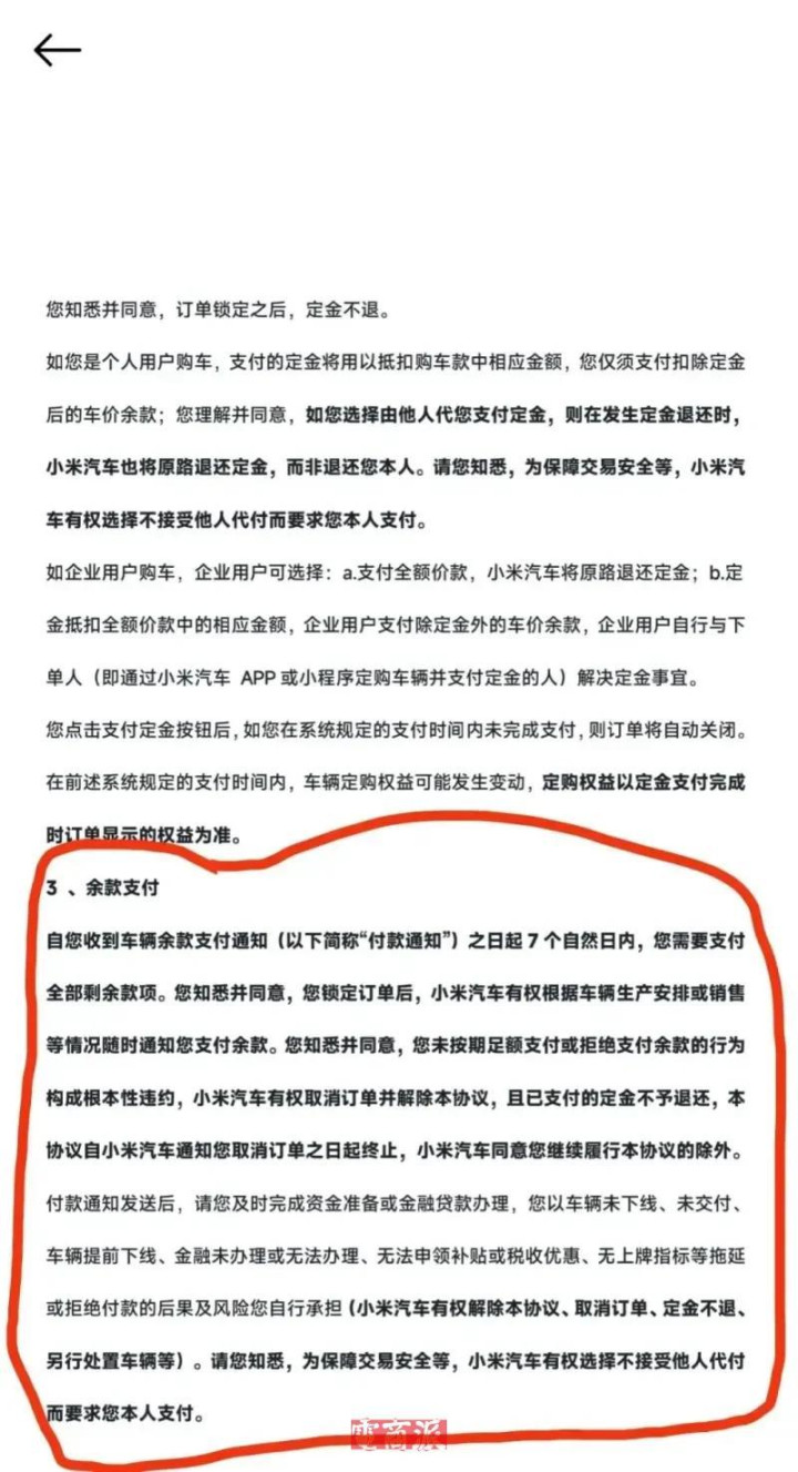 “自用户收到车辆余款支付通知之日起7个自然日内,需支付全部剩余款项。若未按期支付或拒绝支付,小米有权取消订单并不退还定