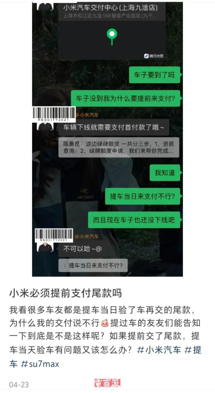 面对媒体质疑,小米客服回应称:“车辆生产完成后会统一发送尾款通知,用户可现场验车,但尾款需按时支付。”至于“能否验车后付款”,客服语焉不详,仅表示“流程各地不同、以交付顾问通知为准”,未作统一明确解释。